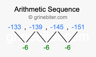 So, what type of sequence is -133, -139, -145, -151? The sequence -133, -139, -145, -151 has a common difference of -6 between each term. We call this kind of sequence an arithmetic sequence. Below is an image illustrating the correlation between the arithmetic sequence -133, -139, -145, -151 and its common difference of -6.