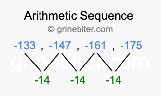So, what type of sequence is -133, -147, -161, -175? The sequence -133, -147, -161, -175 has a common difference of -14 between each term. We call this kind of sequence an arithmetic sequence. Below is an image illustrating the correlation between the arithmetic sequence -133, -147, -161, -175 and its common difference of -14.