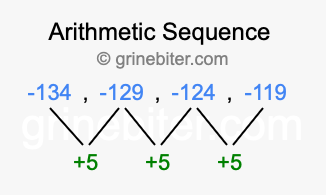 So, what type of sequence is -134, -129, -124, -119? The sequence -134, -129, -124, -119 has a common difference of +5 between each term. We call this kind of sequence an arithmetic sequence. Below is an image illustrating the correlation between the arithmetic sequence -134, -129, -124, -119 and its common difference of +5.