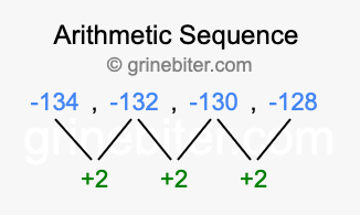 So, what type of sequence is -134, -132, -130, -128? The sequence -134, -132, -130, -128 has a common difference of +2 between each term. We call this kind of sequence an arithmetic sequence. Below is an image illustrating the correlation between the arithmetic sequence -134, -132, -130, -128 and its common difference of +2.