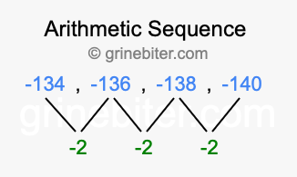 So, what type of sequence is -134, -136, -138, -140? The sequence -134, -136, -138, -140 has a common difference of -2 between each term. We call this kind of sequence an arithmetic sequence. Below is an image illustrating the correlation between the arithmetic sequence -134, -136, -138, -140 and its common difference of -2.