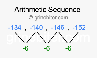 So, what type of sequence is -134, -140, -146, -152? The sequence -134, -140, -146, -152 has a common difference of -6 between each term. We call this kind of sequence an arithmetic sequence. Below is an image illustrating the correlation between the arithmetic sequence -134, -140, -146, -152 and its common difference of -6.