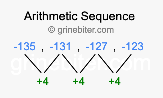 So, what type of sequence is -135, -131, -127, -123? The sequence -135, -131, -127, -123 has a common difference of +4 between each term. We call this kind of sequence an arithmetic sequence. Below is an image illustrating the correlation between the arithmetic sequence -135, -131, -127, -123 and its common difference of +4.