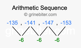 So, what type of sequence is -135, -141, -147, -153? The sequence -135, -141, -147, -153 has a common difference of -6 between each term. We call this kind of sequence an arithmetic sequence. Below is an image illustrating the correlation between the arithmetic sequence -135, -141, -147, -153 and its common difference of -6.