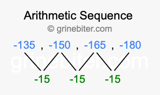 So, what type of sequence is -135, -150, -165, -180? The sequence -135, -150, -165, -180 has a common difference of -15 between each term. We call this kind of sequence an arithmetic sequence. Below is an image illustrating the correlation between the arithmetic sequence -135, -150, -165, -180 and its common difference of -15.