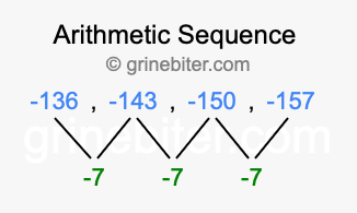 So, what type of sequence is -136, -143, -150, -157? The sequence -136, -143, -150, -157 has a common difference of -7 between each term. We call this kind of sequence an arithmetic sequence. Below is an image illustrating the correlation between the arithmetic sequence -136, -143, -150, -157 and its common difference of -7.
