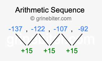 So, what type of sequence is -137, -122, -107, -92? The sequence -137, -122, -107, -92 has a common difference of +15 between each term. We call this kind of sequence an arithmetic sequence. Below is an image illustrating the correlation between the arithmetic sequence -137, -122, -107, -92 and its common difference of +15.