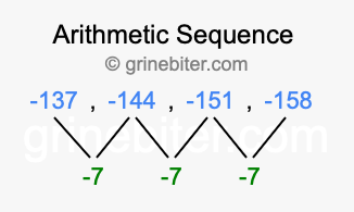 So, what type of sequence is -137, -144, -151, -158? The sequence -137, -144, -151, -158 has a common difference of -7 between each term. We call this kind of sequence an arithmetic sequence. Below is an image illustrating the correlation between the arithmetic sequence -137, -144, -151, -158 and its common difference of -7.