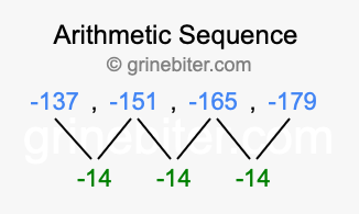 So, what type of sequence is -137, -151, -165, -179? The sequence -137, -151, -165, -179 has a common difference of -14 between each term. We call this kind of sequence an arithmetic sequence. Below is an image illustrating the correlation between the arithmetic sequence -137, -151, -165, -179 and its common difference of -14.