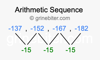 So, what type of sequence is -137, -152, -167, -182? The sequence -137, -152, -167, -182 has a common difference of -15 between each term. We call this kind of sequence an arithmetic sequence. Below is an image illustrating the correlation between the arithmetic sequence -137, -152, -167, -182 and its common difference of -15.