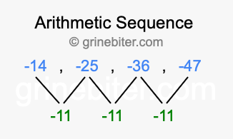So, what type of sequence is -14, -25, -36, -47? The sequence -14, -25, -36, -47 has a common difference of -11 between each term. We call this kind of sequence an arithmetic sequence. Below is an image illustrating the correlation between the arithmetic sequence -14, -25, -36, -47 and its common difference of -11.