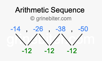 So, what type of sequence is -14, -26, -38, -50? The sequence -14, -26, -38, -50 has a common difference of -12 between each term. We call this kind of sequence an arithmetic sequence. Below is an image illustrating the correlation between the arithmetic sequence -14, -26, -38, -50 and its common difference of -12.