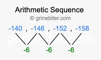 So, what type of sequence is -140, -146, -152, -158? The sequence -140, -146, -152, -158 has a common difference of -6 between each term. We call this kind of sequence an arithmetic sequence. Below is an image illustrating the correlation between the arithmetic sequence -140, -146, -152, -158 and its common difference of -6.