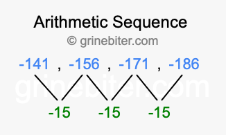 So, what type of sequence is -141, -156, -171, -186? The sequence -141, -156, -171, -186 has a common difference of -15 between each term. We call this kind of sequence an arithmetic sequence. Below is an image illustrating the correlation between the arithmetic sequence -141, -156, -171, -186 and its common difference of -15.