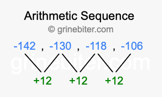 So, what type of sequence is -142, -130, -118, -106? The sequence -142, -130, -118, -106 has a common difference of +12 between each term. We call this kind of sequence an arithmetic sequence. Below is an image illustrating the correlation between the arithmetic sequence -142, -130, -118, -106 and its common difference of +12.