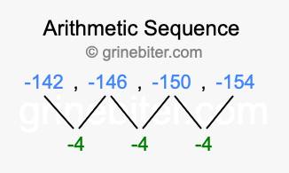 So, what type of sequence is -142, -146, -150, -154? The sequence -142, -146, -150, -154 has a common difference of -4 between each term. We call this kind of sequence an arithmetic sequence. Below is an image illustrating the correlation between the arithmetic sequence -142, -146, -150, -154 and its common difference of -4.