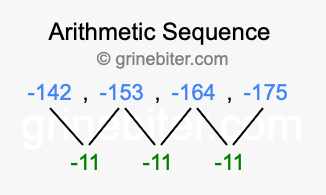 So, what type of sequence is -142, -153, -164, -175? The sequence -142, -153, -164, -175 has a common difference of -11 between each term. We call this kind of sequence an arithmetic sequence. Below is an image illustrating the correlation between the arithmetic sequence -142, -153, -164, -175 and its common difference of -11.