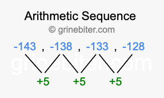 So, what type of sequence is -143, -138, -133, -128? The sequence -143, -138, -133, -128 has a common difference of +5 between each term. We call this kind of sequence an arithmetic sequence. Below is an image illustrating the correlation between the arithmetic sequence -143, -138, -133, -128 and its common difference of +5.