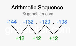 So, what type of sequence is -144, -132, -120, -108? The sequence -144, -132, -120, -108 has a common difference of +12 between each term. We call this kind of sequence an arithmetic sequence. Below is an image illustrating the correlation between the arithmetic sequence -144, -132, -120, -108 and its common difference of +12.