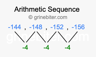 So, what type of sequence is -144, -148, -152, -156? The sequence -144, -148, -152, -156 has a common difference of -4 between each term. We call this kind of sequence an arithmetic sequence. Below is an image illustrating the correlation between the arithmetic sequence -144, -148, -152, -156 and its common difference of -4.