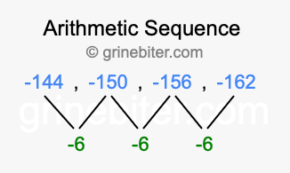 So, what type of sequence is -144, -150, -156, -162? The sequence -144, -150, -156, -162 has a common difference of -6 between each term. We call this kind of sequence an arithmetic sequence. Below is an image illustrating the correlation between the arithmetic sequence -144, -150, -156, -162 and its common difference of -6.