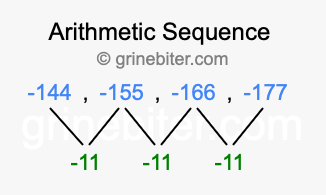 So, what type of sequence is -144, -155, -166, -177? The sequence -144, -155, -166, -177 has a common difference of -11 between each term. We call this kind of sequence an arithmetic sequence. Below is an image illustrating the correlation between the arithmetic sequence -144, -155, -166, -177 and its common difference of -11.