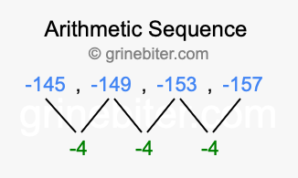 So, what type of sequence is -145, -149, -153, -157? The sequence -145, -149, -153, -157 has a common difference of -4 between each term. We call this kind of sequence an arithmetic sequence. Below is an image illustrating the correlation between the arithmetic sequence -145, -149, -153, -157 and its common difference of -4.