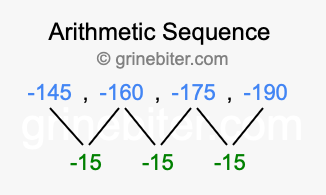 So, what type of sequence is -145, -160, -175, -190? The sequence -145, -160, -175, -190 has a common difference of -15 between each term. We call this kind of sequence an arithmetic sequence. Below is an image illustrating the correlation between the arithmetic sequence -145, -160, -175, -190 and its common difference of -15.