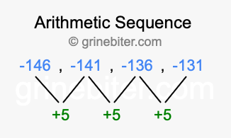 So, what type of sequence is -146, -141, -136, -131? The sequence -146, -141, -136, -131 has a common difference of +5 between each term. We call this kind of sequence an arithmetic sequence. Below is an image illustrating the correlation between the arithmetic sequence -146, -141, -136, -131 and its common difference of +5.