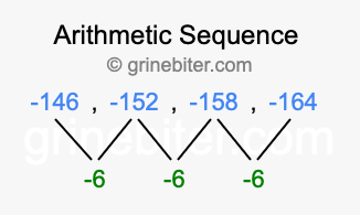 So, what type of sequence is -146, -152, -158, -164? The sequence -146, -152, -158, -164 has a common difference of -6 between each term. We call this kind of sequence an arithmetic sequence. Below is an image illustrating the correlation between the arithmetic sequence -146, -152, -158, -164 and its common difference of -6.