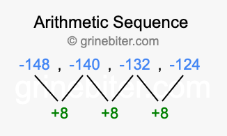 So, what type of sequence is -148, -140, -132, -124? The sequence -148, -140, -132, -124 has a common difference of +8 between each term. We call this kind of sequence an arithmetic sequence. Below is an image illustrating the correlation between the arithmetic sequence -148, -140, -132, -124 and its common difference of +8.