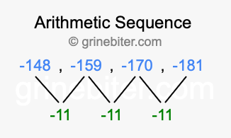 So, what type of sequence is -148, -159, -170, -181? The sequence -148, -159, -170, -181 has a common difference of -11 between each term. We call this kind of sequence an arithmetic sequence. Below is an image illustrating the correlation between the arithmetic sequence -148, -159, -170, -181 and its common difference of -11.