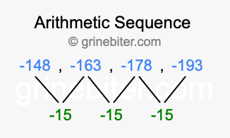 So, what type of sequence is -148, -163, -178, -193? The sequence -148, -163, -178, -193 has a common difference of -15 between each term. We call this kind of sequence an arithmetic sequence. Below is an image illustrating the correlation between the arithmetic sequence -148, -163, -178, -193 and its common difference of -15.
