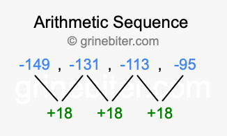 So, what type of sequence is -149, -131, -113, -95? The sequence -149, -131, -113, -95 has a common difference of +18 between each term. We call this kind of sequence an arithmetic sequence. Below is an image illustrating the correlation between the arithmetic sequence -149, -131, -113, -95 and its common difference of +18.