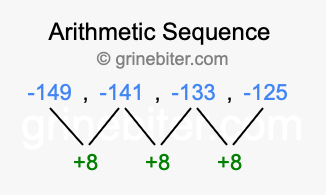 So, what type of sequence is -149, -141, -133, -125? The sequence -149, -141, -133, -125 has a common difference of +8 between each term. We call this kind of sequence an arithmetic sequence. Below is an image illustrating the correlation between the arithmetic sequence -149, -141, -133, -125 and its common difference of +8.