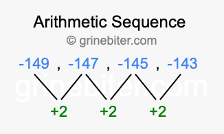So, what type of sequence is -149, -147, -145, -143? The sequence -149, -147, -145, -143 has a common difference of +2 between each term. We call this kind of sequence an arithmetic sequence. Below is an image illustrating the correlation between the arithmetic sequence -149, -147, -145, -143 and its common difference of +2.