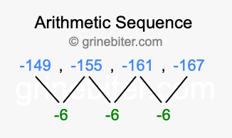 So, what type of sequence is -149, -155, -161, -167? The sequence -149, -155, -161, -167 has a common difference of -6 between each term. We call this kind of sequence an arithmetic sequence. Below is an image illustrating the correlation between the arithmetic sequence -149, -155, -161, -167 and its common difference of -6.