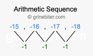 So, what type of sequence is -15, -16, -17, -18? The sequence -15, -16, -17, -18 has a common difference of -1 between each term. We call this kind of sequence an arithmetic sequence. Below is an image illustrating the correlation between the arithmetic sequence -15, -16, -17, -18 and its common difference of -1.