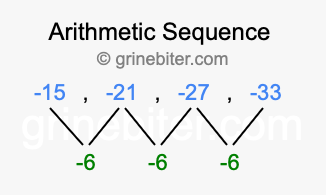 So, what type of sequence is -15, -21, -27, -33? The sequence -15, -21, -27, -33 has a common difference of -6 between each term. We call this kind of sequence an arithmetic sequence. Below is an image illustrating the correlation between the arithmetic sequence -15, -21, -27, -33 and its common difference of -6.