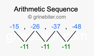 So, what type of sequence is -15, -26, -37, -48? The sequence -15, -26, -37, -48 has a common difference of -11 between each term. We call this kind of sequence an arithmetic sequence. Below is an image illustrating the correlation between the arithmetic sequence -15, -26, -37, -48 and its common difference of -11.