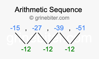 So, what type of sequence is -15, -27, -39, -51? The sequence -15, -27, -39, -51 has a common difference of -12 between each term. We call this kind of sequence an arithmetic sequence. Below is an image illustrating the correlation between the arithmetic sequence -15, -27, -39, -51 and its common difference of -12.