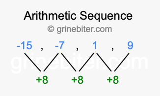 So, what type of sequence is -15, -7, 1, 9? The sequence -15, -7, 1, 9 has a common difference of +8 between each term. We call this kind of sequence an arithmetic sequence. Below is an image illustrating the correlation between the arithmetic sequence -15, -7, 1, 9 and its common difference of +8.