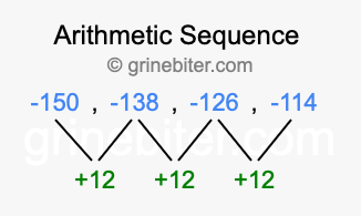 So, what type of sequence is -150, -138, -126, -114? The sequence -150, -138, -126, -114 has a common difference of +12 between each term. We call this kind of sequence an arithmetic sequence. Below is an image illustrating the correlation between the arithmetic sequence -150, -138, -126, -114 and its common difference of +12.