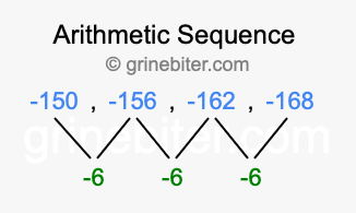 So, what type of sequence is -150, -156, -162, -168? The sequence -150, -156, -162, -168 has a common difference of -6 between each term. We call this kind of sequence an arithmetic sequence. Below is an image illustrating the correlation between the arithmetic sequence -150, -156, -162, -168 and its common difference of -6.