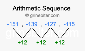 So, what type of sequence is -151, -139, -127, -115? The sequence -151, -139, -127, -115 has a common difference of +12 between each term. We call this kind of sequence an arithmetic sequence. Below is an image illustrating the correlation between the arithmetic sequence -151, -139, -127, -115 and its common difference of +12.