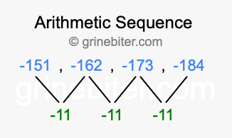 So, what type of sequence is -151, -162, -173, -184? The sequence -151, -162, -173, -184 has a common difference of -11 between each term. We call this kind of sequence an arithmetic sequence. Below is an image illustrating the correlation between the arithmetic sequence -151, -162, -173, -184 and its common difference of -11.