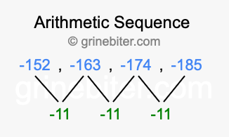So, what type of sequence is -152, -163, -174, -185? The sequence -152, -163, -174, -185 has a common difference of -11 between each term. We call this kind of sequence an arithmetic sequence. Below is an image illustrating the correlation between the arithmetic sequence -152, -163, -174, -185 and its common difference of -11.