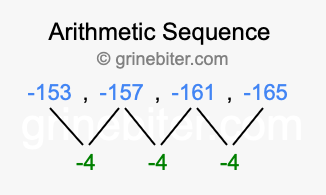 So, what type of sequence is -153, -157, -161, -165? The sequence -153, -157, -161, -165 has a common difference of -4 between each term. We call this kind of sequence an arithmetic sequence. Below is an image illustrating the correlation between the arithmetic sequence -153, -157, -161, -165 and its common difference of -4.