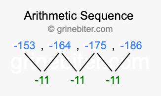 So, what type of sequence is -153, -164, -175, -186? The sequence -153, -164, -175, -186 has a common difference of -11 between each term. We call this kind of sequence an arithmetic sequence. Below is an image illustrating the correlation between the arithmetic sequence -153, -164, -175, -186 and its common difference of -11.