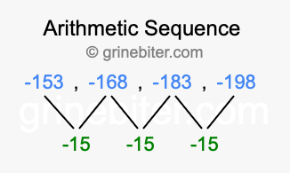 So, what type of sequence is -153, -168, -183, -198? The sequence -153, -168, -183, -198 has a common difference of -15 between each term. We call this kind of sequence an arithmetic sequence. Below is an image illustrating the correlation between the arithmetic sequence -153, -168, -183, -198 and its common difference of -15.